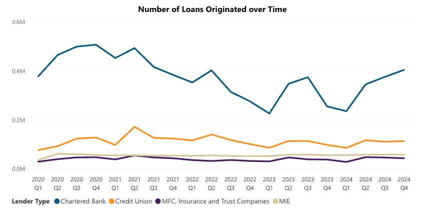 Roughly 85-90% of mortgages originated in Canada in 2024 were through a bank, credit union, or mortgage finance company. In other words, “prime” lenders.